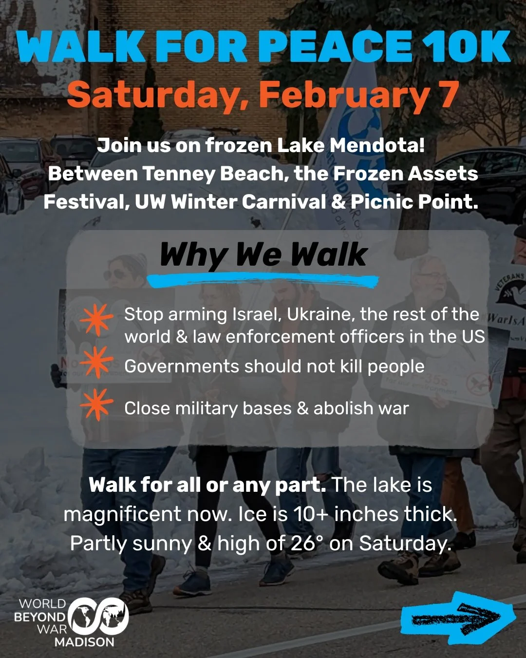 Madison for a World BEYOND War invites you to walk with us on frozen Lake Mendota! We will walk between Tenney Beach, the Frozen Assets Festival, UW Winter Carnival & Picnic Point. As the Buddhist Walk for Peace finishes their 2,300 mile journey from Texas to DC, and the Trump administration has just bypassed Congress to send another $6 billion of weapons to Israel, we will walk here in Madison to call for war abolition.